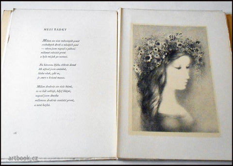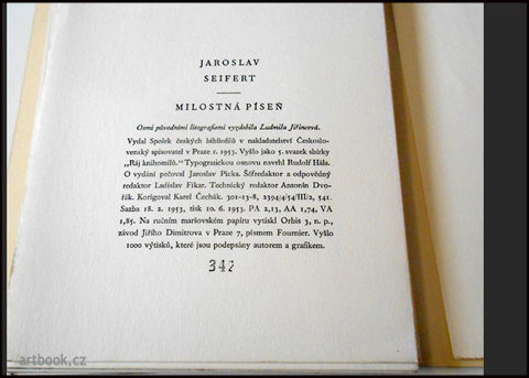 Vybrané básně. Praha; Spolek českých bibliofilů; Československý spisovatel; 1953. 5. sv sbírky 'Ráj knihomilů.' O vydání pečoval Jaroslav Picka. 95 s.; osm pův. litografií LUDMILA JIŘINCOVÁ; typo RUDOLF HÁLA. Podpisy J. Seiferta a L. Jiřncové. Volné složky v pův. pap. obálce. 180x135 Povrch obálky vlivem světla místy vybledlý. /kniha v obchodě 0925/