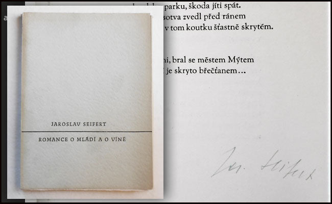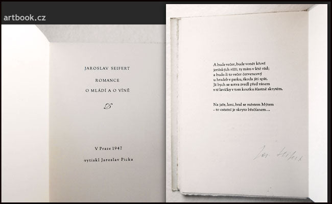 Praha, Picka, 1947. 49 s., na poslední straně, pod závěrečným veršem, modrým inkoustem podpis Jaroslava Seiferta. Volné archy v pův. pap. obálce. 195x145