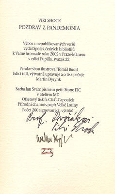 Praha, Spolek českých bibliofilů, 2002. Edice Pupilla sv.22. 17 s., perokresba TOMÁŠ BUDIL (sign.), ex. č. 23/200, podpisy autorů v tiráži, přírodní chamois papír. Pův. brož. 135x88