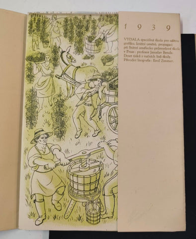 Státní uměleckoprůmyslová škola v Praze. Speciálka pro užitou grafiku, knižní umění a propagaci: profesor Jaroslav Benda. Deset tisků z ručních lisů školy. 4 původní litografie EMIL ZIMMER, jednostranný tisk.
