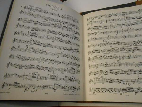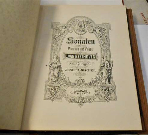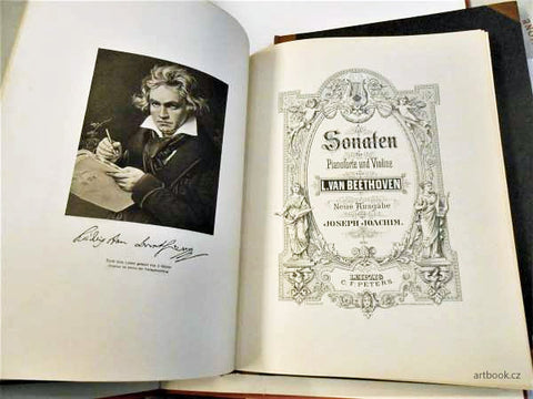 Sonáty pro klavír a housle: Op.12 č.1 / Op.12 č.2 / Op.12 č.3 / Op.23 / Op.24 / Op.30 č.1 / Op.30 č.2 / Op.30 č.3 / Op.47 / Op.96. V prvním svazku portrét Beethovenův s faksimile jeho podpisu. Dobové, polokožené vazby, na hřbetě zlacená ražba iniciály "B". Velmi dobře zachováno!