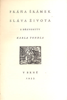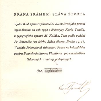 Brno, Klub výtvarných umělců Aleš, 1933. 36 s., dřevoryty (3 celostr. a 3 v textu) KAREL TONDL, typografická úprava M. KALÁB. Podpis výtvarníka v tiráži. Tištěno na holandském papíru Pannekoek ve 400 exemplářích. Výtisk č. 363. Celopl. vazba. 195x130