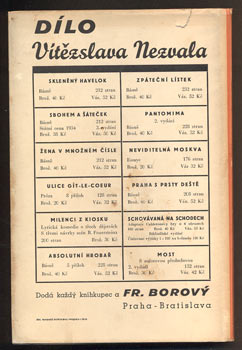 Praha, Borový, 1937. 1. vyd. 225 s., 5 příloh s 6 dekalky V. Nezvala. Obálka (s použitím dekalku V. N.), frontispis, vazba a typo JINDŘICH ŠTYRSKÝ. Pův. celopl. vazba s obálkou. 210x140 /H/
