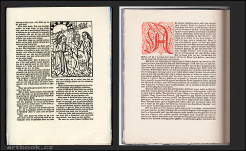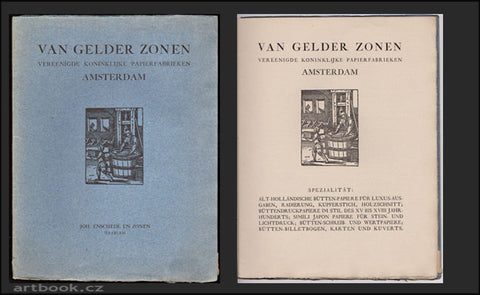 Haarlem, Joh. Enschede en Zonen, 1925. 18 s., červeně tištěné iniciály, ukázky textu z různých typů a velikosti písma, 3 dřevoryty, něm. a franc. text. Ruční papír. Pův. brož. 265x200