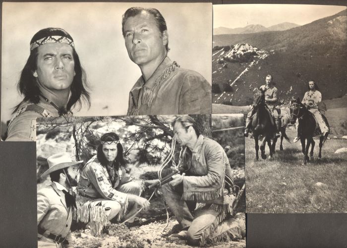 3x Černobílá fotografická pohlednice. Praha, ÚPF, Pressfoto. Old Shatterhend - Lex Barker. Vinnetou - Pierre Brice. 120x180 Krásný stav, nepopsané. /Ate/
