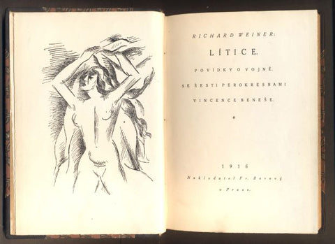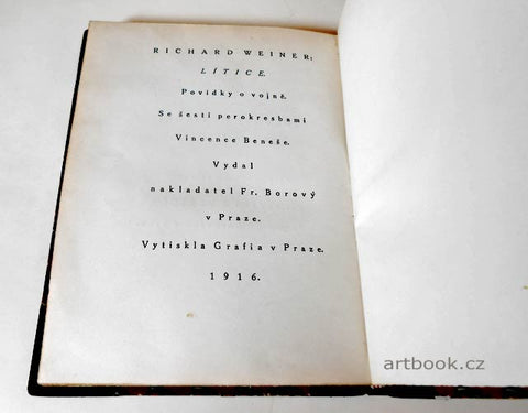 Povídky o vojně. Praha, Fr. Borový, 1916. 1. vyd. 154 s., 6 perokreseb VINCENC BENEŠ. Dobová polokožená vazba, zlatá vrchní ořízka. 180x140 Hrany desek místy s drobnými oděrky. Mezi blokem a předním předsádkovým listem, vnitřní drážka mírně popraskaná, listy nepoškozené s přirozenou patinou zahnědnutí vlivem stáří a druhu papíru. /Ate24/