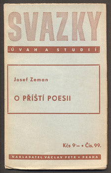 Úvaha čtenáře o básních a básnících. Praha, Václav Petr, 1947. Svazky úvah a studií č. 99. 1. vyd. Řídí Fr. Kovárna. 45 s., obálka a úprava JAROSLAV ŠVÁB. Pův. brož. 190x120 Velmi dobře zachováno. /H/